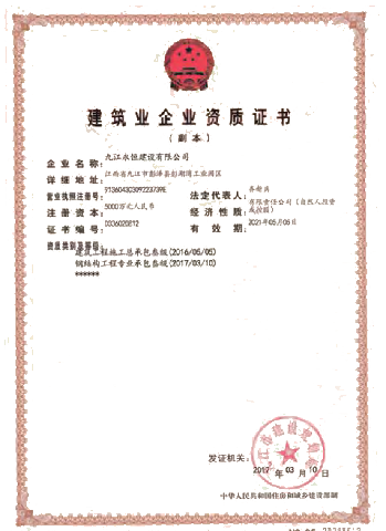 九江永恒建設(shè)有限公司 坐落于九江彭湖灣工業(yè)園區(qū)。緊鄰彭湖高速、長江,交通十分便利。公司成立于2013年11月,占地面積66000平方米,廠房面積40000平方米,公司注冊資金5000萬元。是主要從事鋼結(jié)構(gòu)建筑設(shè)計、制作、安裝、重型鋼結(jié)構(gòu)件加工、新型建筑材料生產(chǎn)的大型鋼結(jié)構(gòu)企業(yè)。